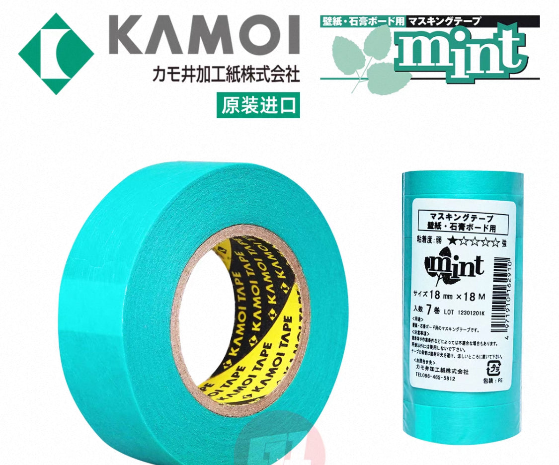 7-Roll, 18mm Wide Japan KAMOI Mint Masking Tapes for Delicate Surfaces